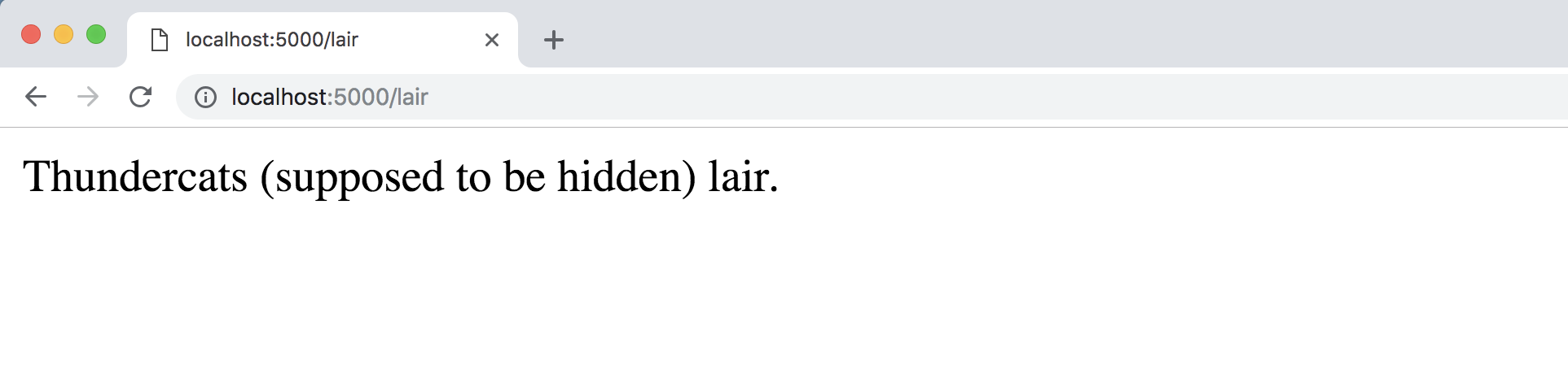 Now go to our "hidden lair" at localhost:5000/lair/. Eventually this page should require authentication to access, but for now it appears without any login challenge: